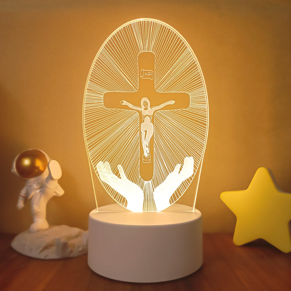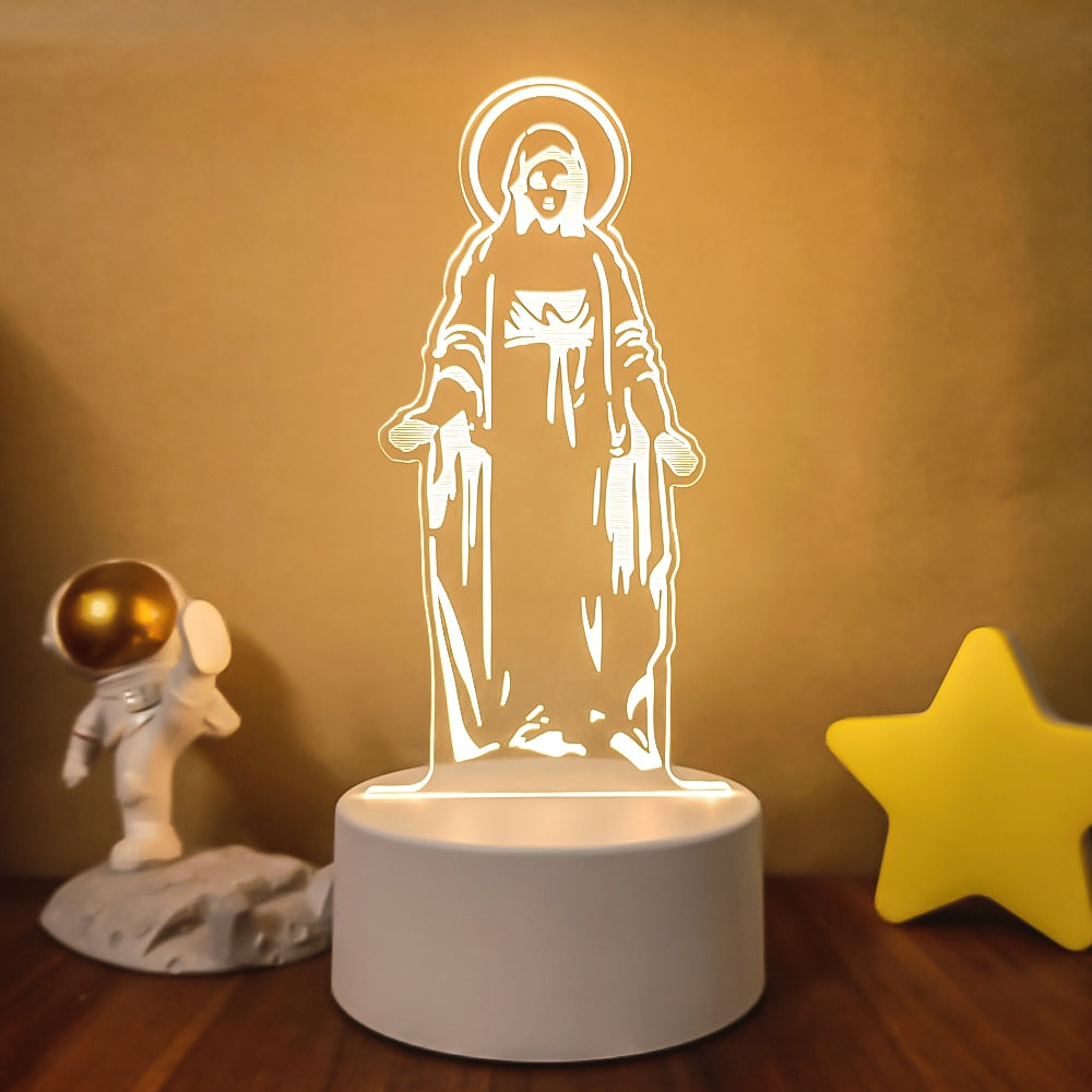A luminária de Led 3D de Jesus, simboliza paz, proteção e amor que devotos tem pela religião, a força idel para pessoas que querem expressar sua fé, aproximar-se ainda mais do seu lado religioso. Tornando o ambiente do seu lar ainda mais lindo e agradável.